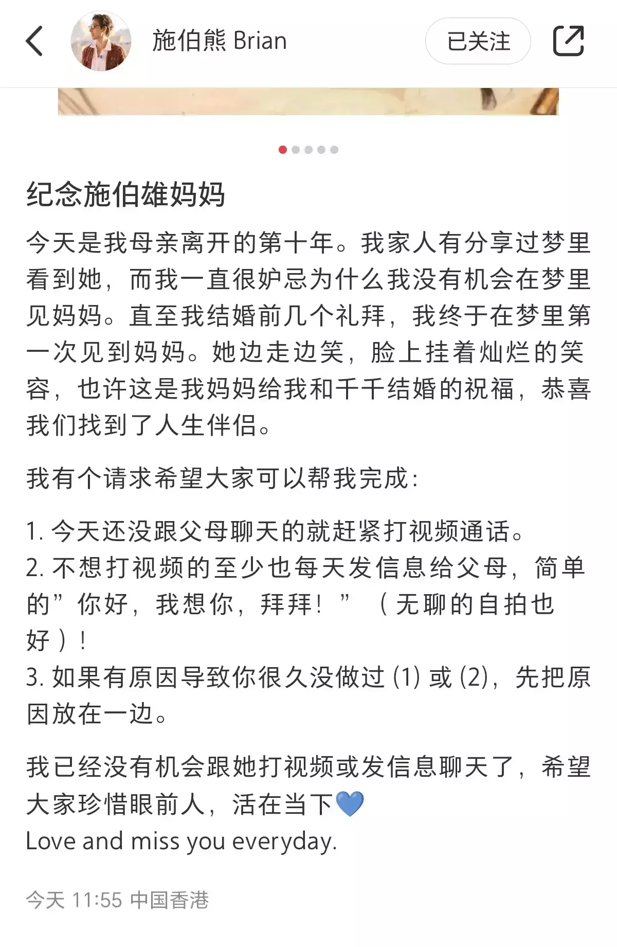 2024年11月19日,施伯雄操心他的姆妈,他在我方的酬酢媒体上发文,何况配上了一些操心姆妈的像片。施伯雄说,家里东说念主皆梦见了姆妈,唯有他莫得,他很惊叹,直到他跟吴千语授室前,姆妈终于出目前我方的梦里了。
