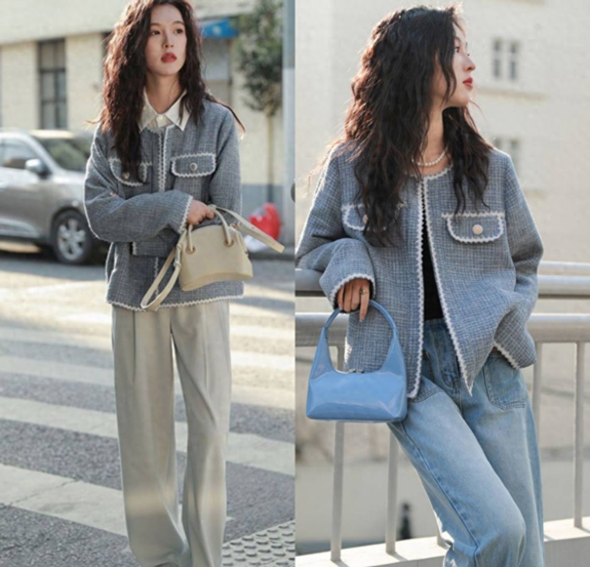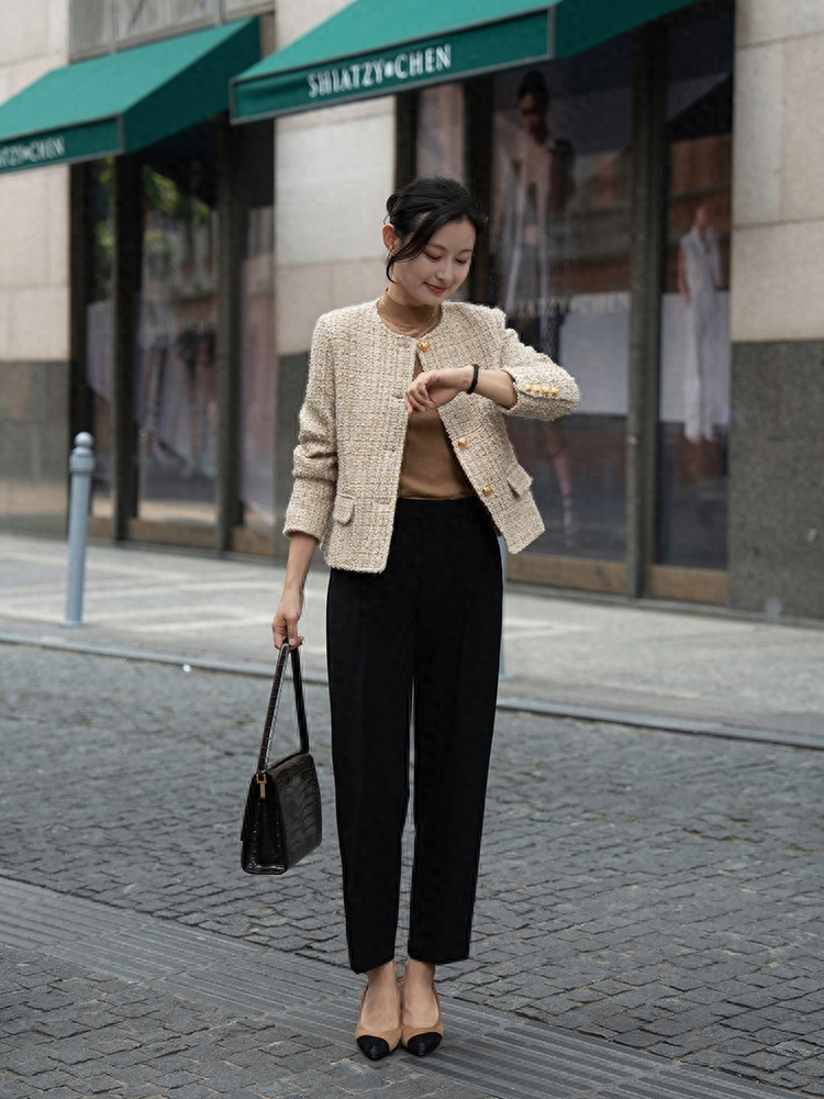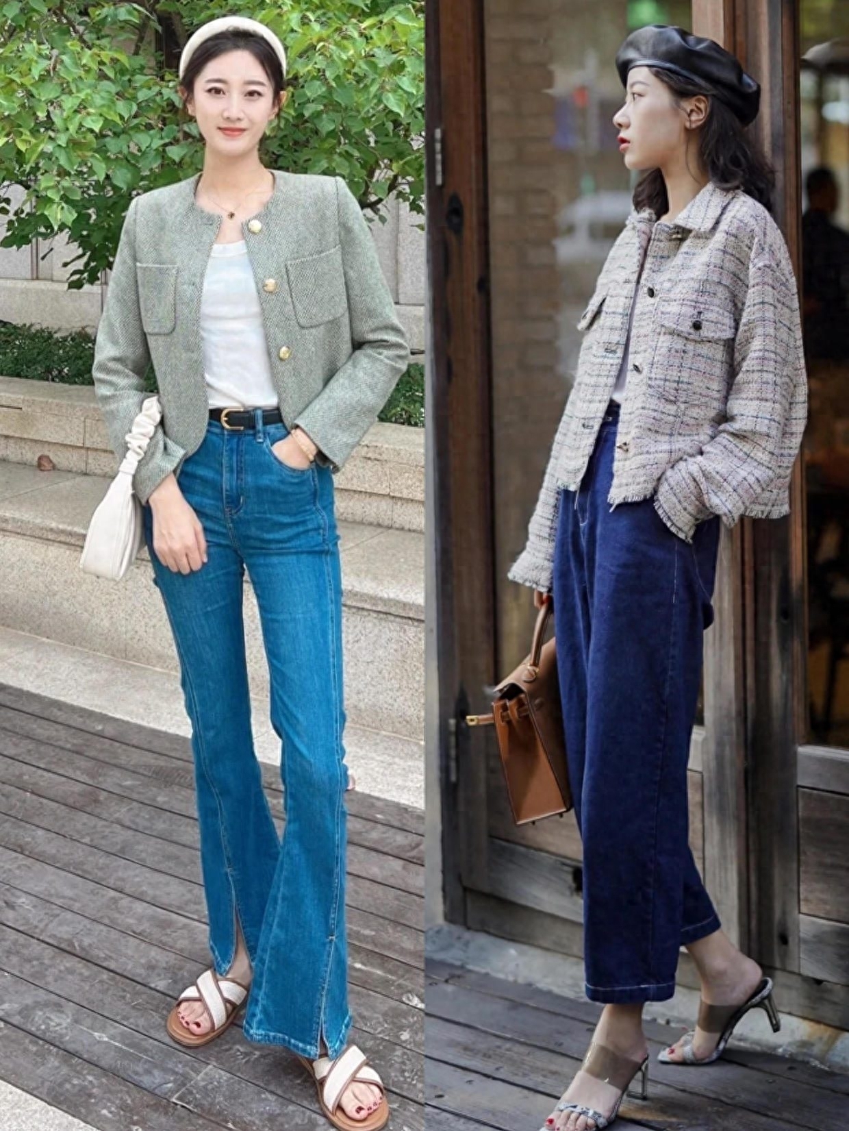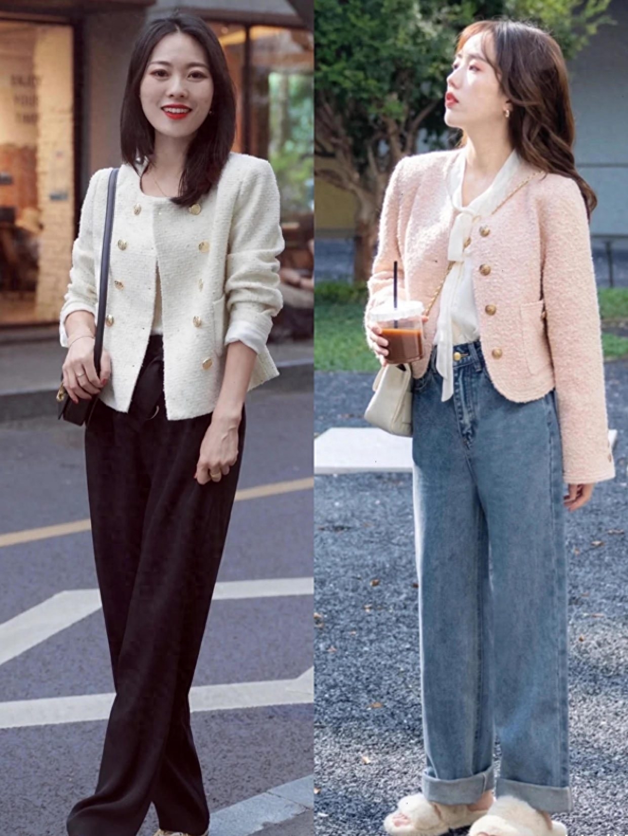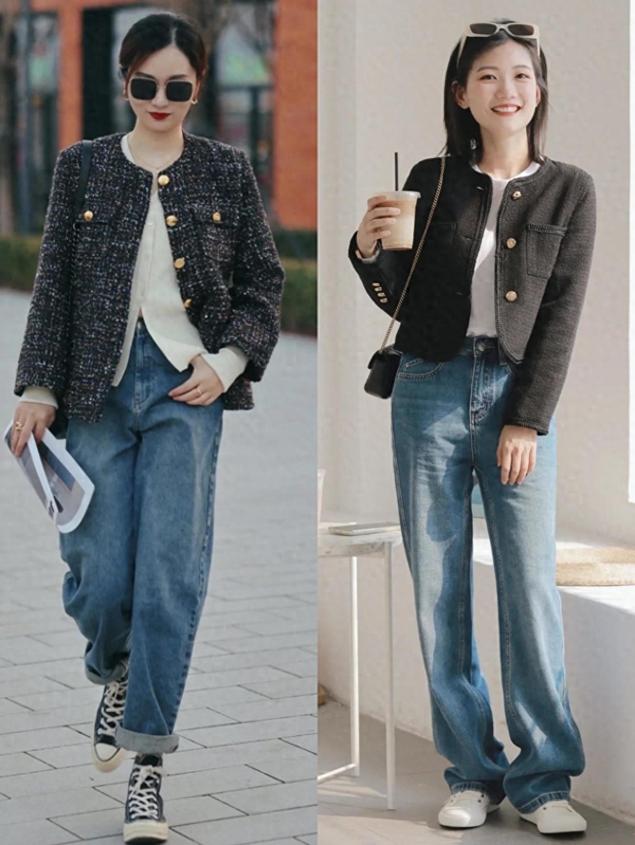 2. 小香风外衣+牛仔裤除了搭配诚实衫以外,小香风外衣还不错搭配牛仔裤。这种搭配形貌比拟闲隙,恰当放工后与共事或一又友聚餐时穿戴。不错选用一条修身牛仔裤来搭配小香风外衣,这么随意凸起女性的身材线条,显瘦又前卫。