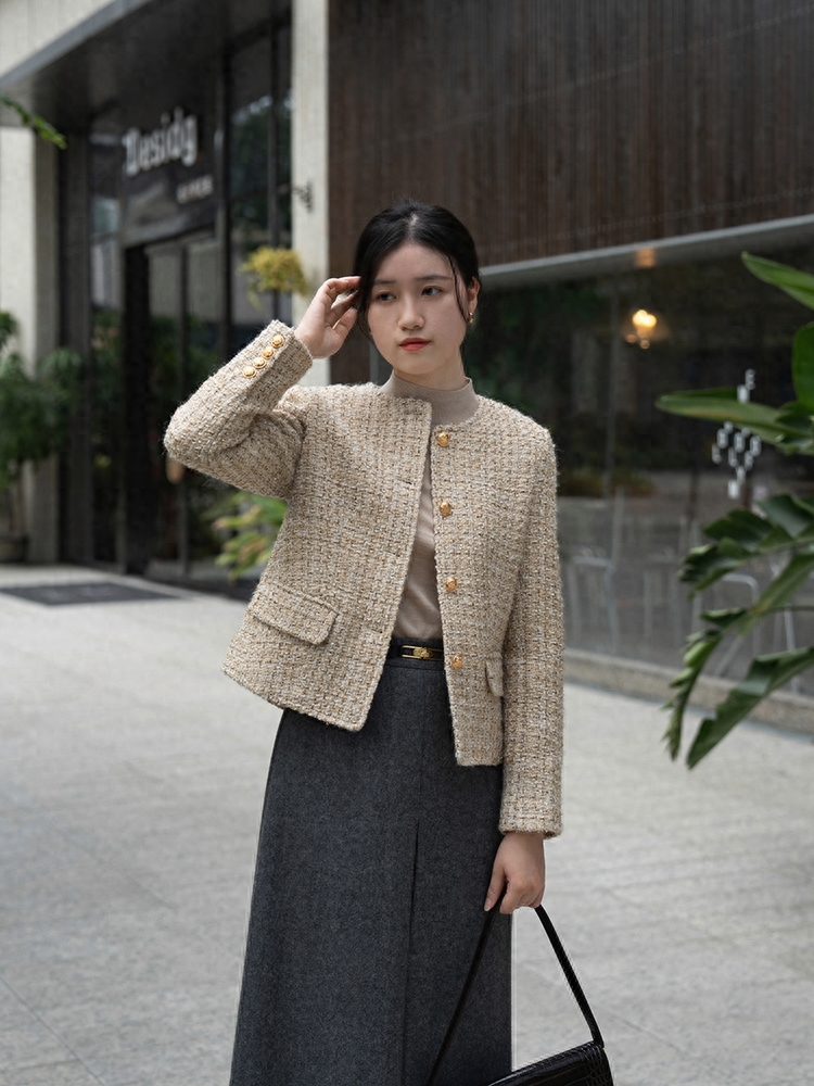它的短款缱绻让下半身的比例显得愈加修长,从而起到显高的作用。此外,小香外衣的节约缱绻立场使其百搭性强,不错与多样格式的服装进行搭配。